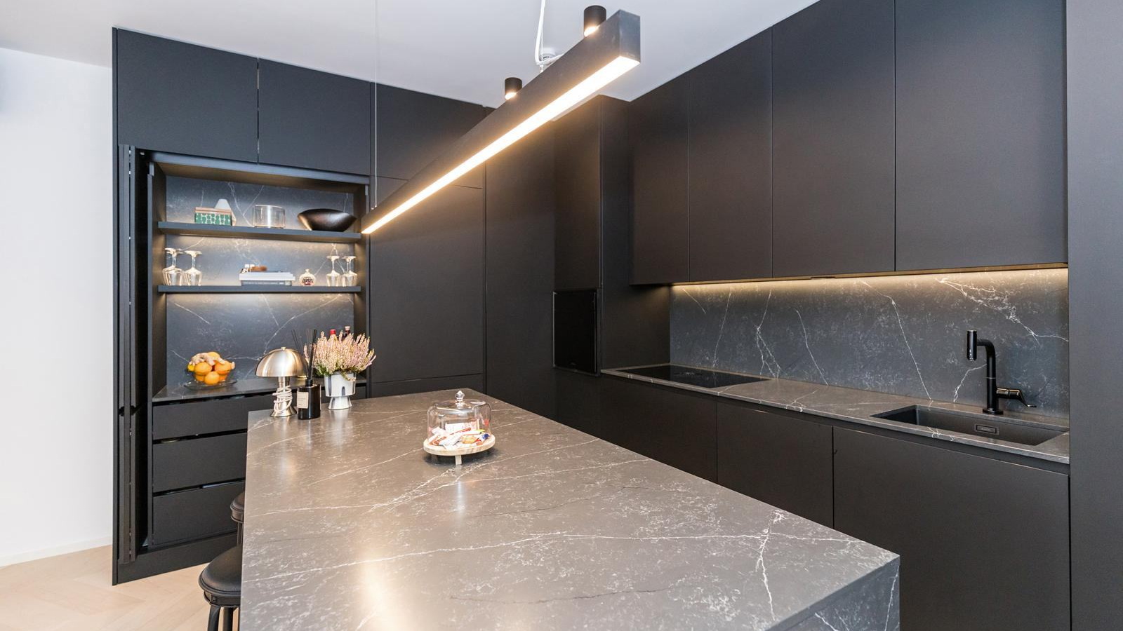 • Kuhinja: Izrađena od Fenix materijala, opremljena BORA ugradbenom pločom i pećnicom, AEG hladnjakom i Miele perilicom posuđa.